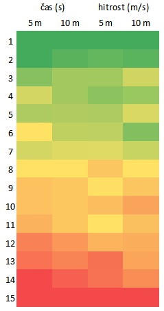 - Profil pospeševanja (Razmerje 5 m : 10 m) Primerjava startnega pospeška in hitrosti na daljši razdalji razkriva individualno specifiko hitrostne krivulje.