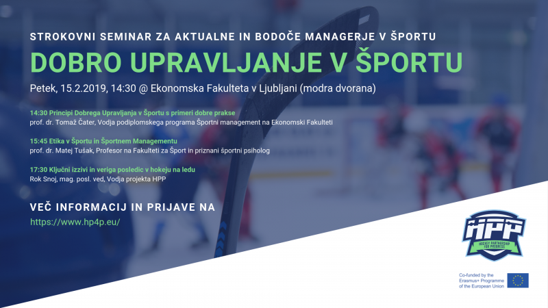 V okviru evropskega projekta HPP – Hockey Partnership for Progress v so-organizaciji Hokejske Zveze Slovenije, Ekonomske Fakultete (EF) in Fakultete za Šport (FŠ) ter preostalih projektnih partnerjev vas vabimo k udeležbi na seminarju na temo dobrega upravljanja v športu.
